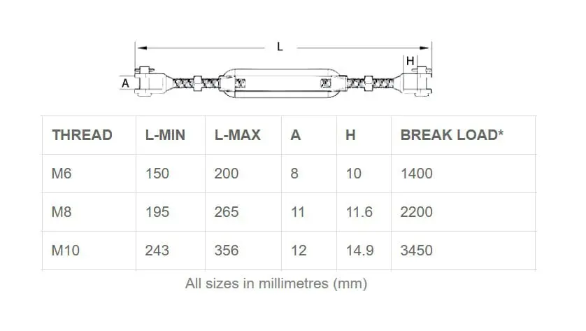 Each turnbuckle includes a forged stainless steel frame with two forged Jaw terminals—one threaded left-hand, the other right-hand. This design allows for easy tension adjustment by simply rotating the central body.